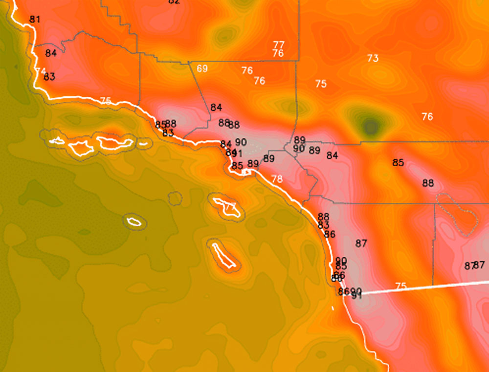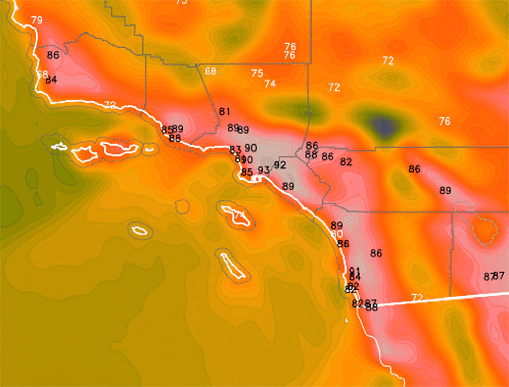 Forecast: Offshore flow and Santa Ana Winds in the area through today will bring more warming to the area than what was seen yesterday.  As stated in the previous article, warmer weather than the last seven days is expected over this next two-day stretch for areas below passes and canyons south and west of the mountains.