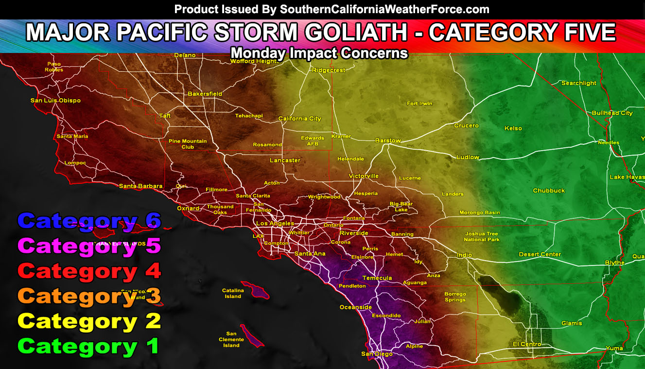Major Pacific Storm Goliath is a category five system and it will hit on Monday. He’ll produce strong winds with the front on Monday morning, first very early before sunrise for areas west of Ventura and just after sunrise for areas in the LA/OC/IE/SD metro and surrounding areas. The system has the potential to have tops of over 30,000 feet and this means the icing layer will be so thick that the storm front will contain incredible charges to produce frequent lightning.
