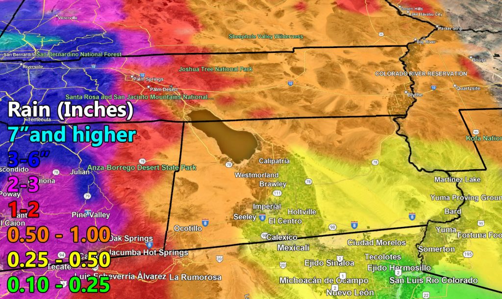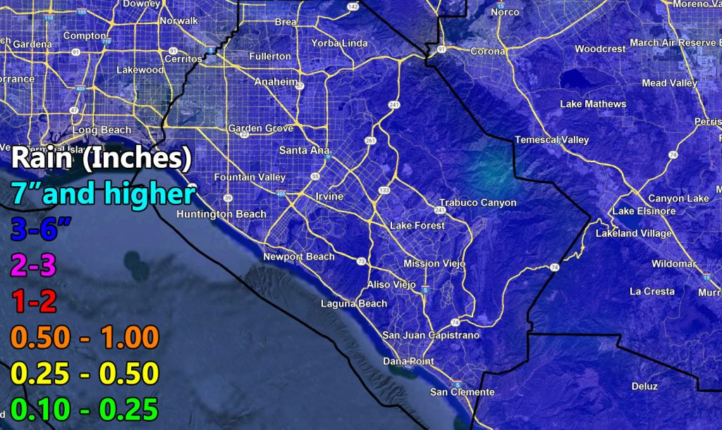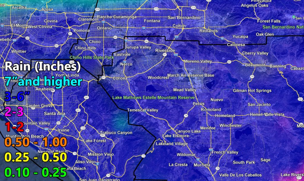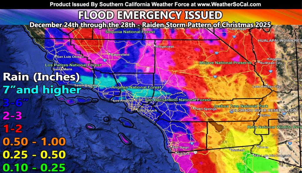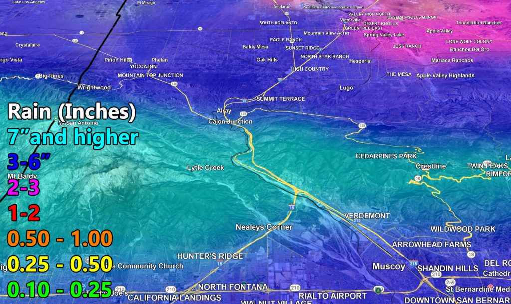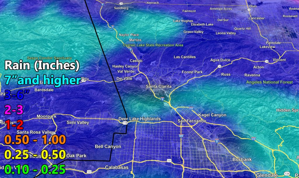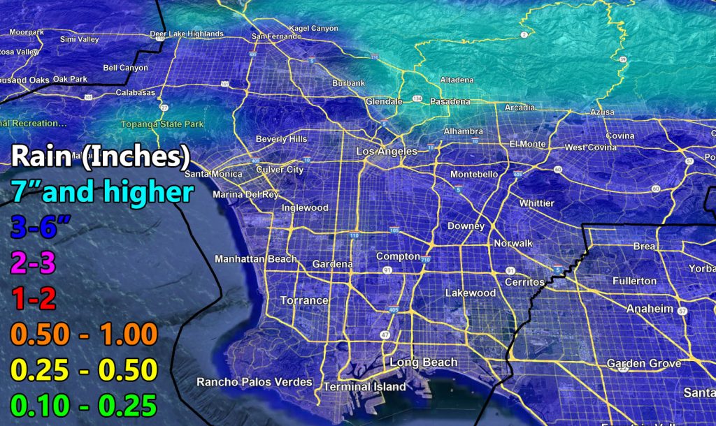 Los Angeles will see 5″ of rain, San Diego between 2 and 4″, and our mountain zones could easily surpass 7-10″ of rain.