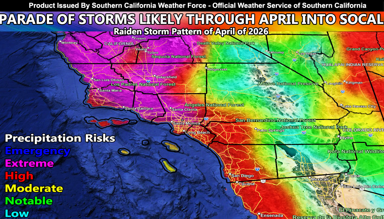 A Raiden Storm Pattern means that no other source (Including SCWF Partners) is predicting what pattern in the super long range numbers are showing here at Southern California Weather Force, aptly named by who discovered it, and that ‘other sources’ will overtime only parrot what you just read here ahead of time. If you rely on a long range forecast for rainfall due to agriculture or other means, you are remaining in the right place. The coming series of storms will be called the Raiden Storm Pattern of April 2026, which looks significant.