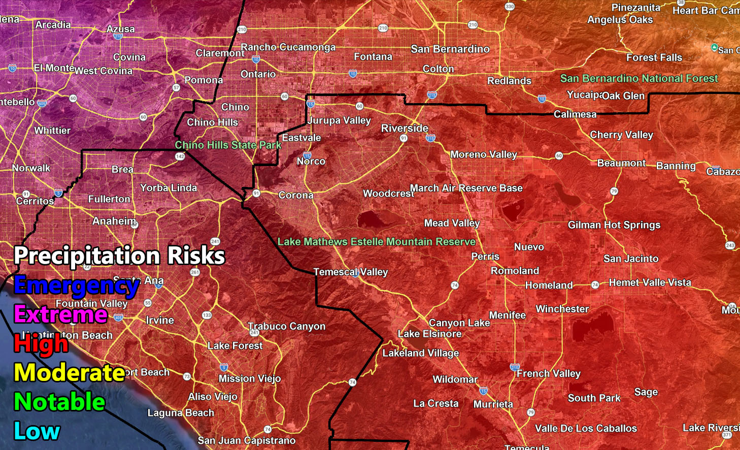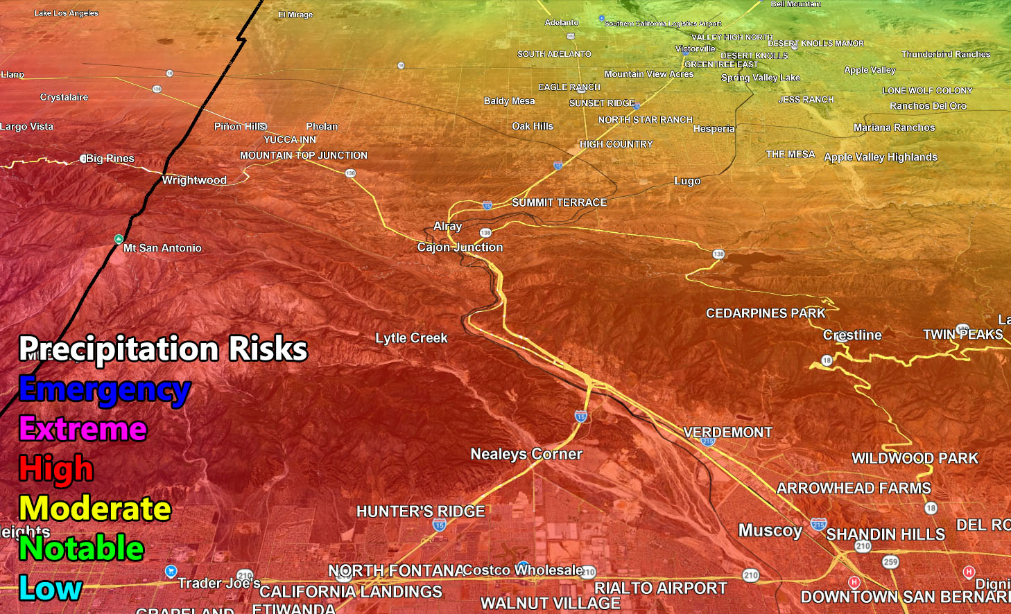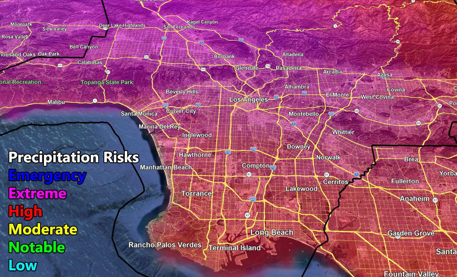 Locations: You can see from the maps that high and extreme risk exists for all metro areas south and west of the mountain and desert regions. The focus, as always with pacific storms in this type of flow, will be the populated zones.