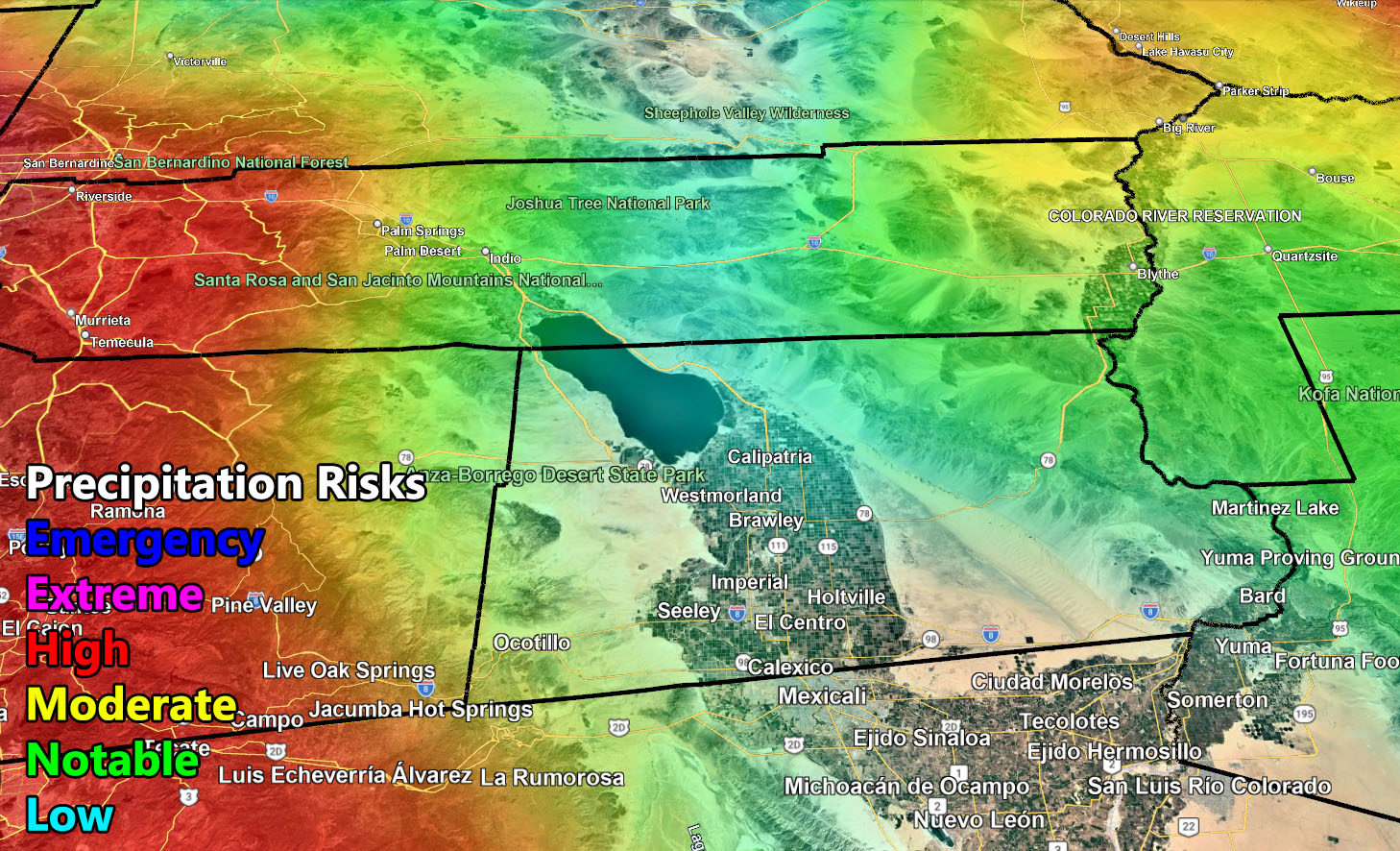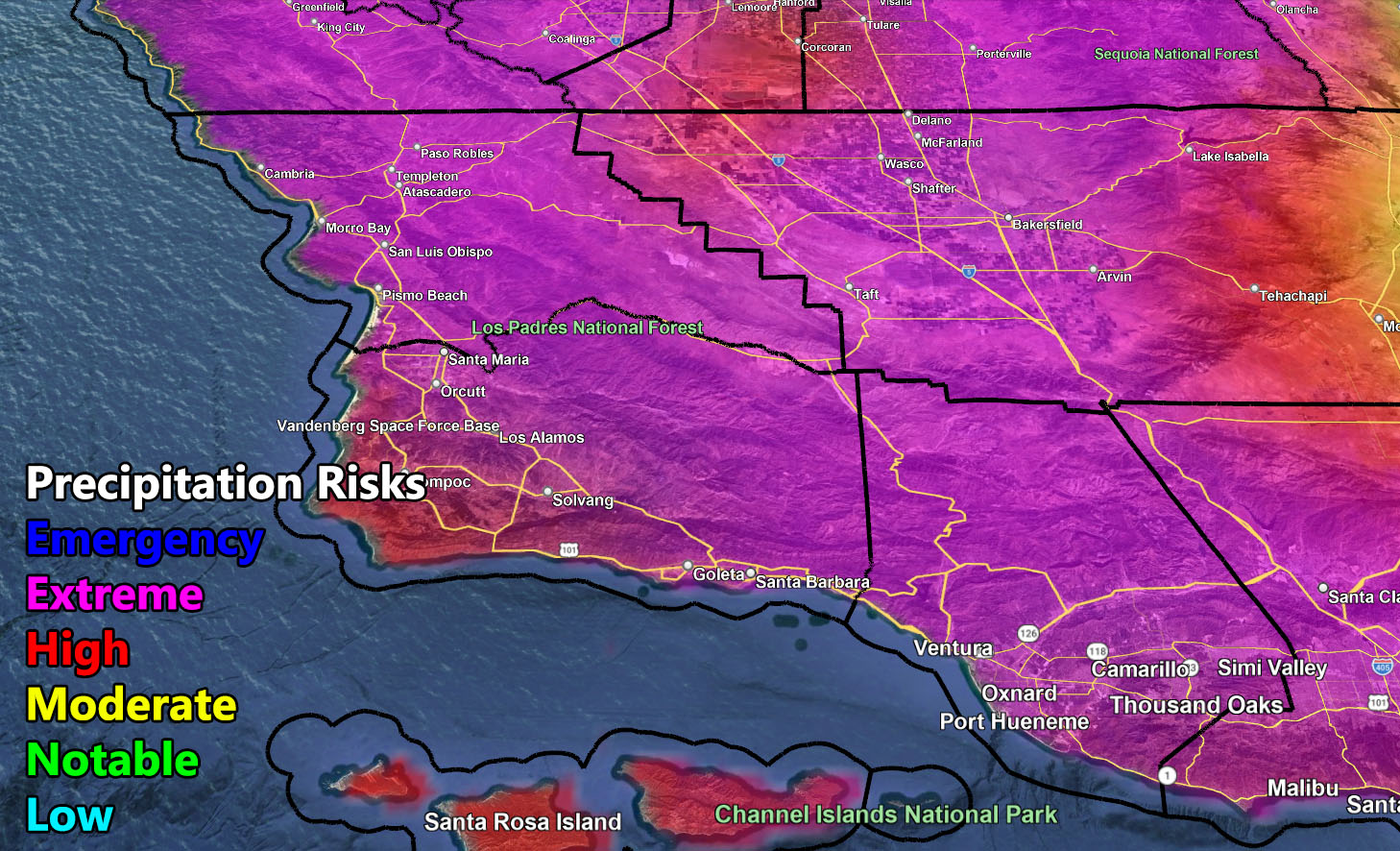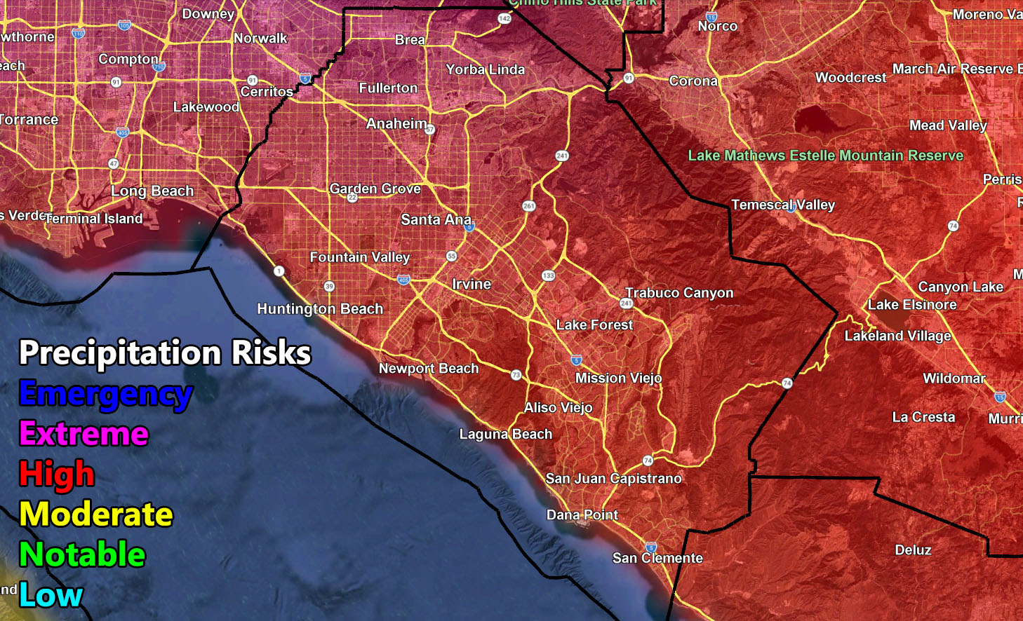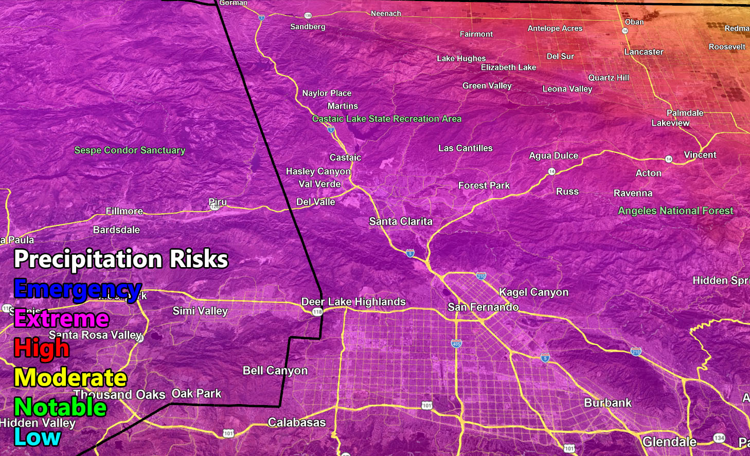 Locations: You can see from the maps that high and extreme risk exists for all metro areas south and west of the mountain and desert regions. The focus, as always with pacific storms in this type of flow, will be the populated zones.